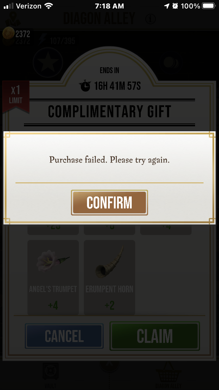 I’m unable to collect my complimentary gift and buy energy from Diagon Alley. I want my gift! I already finished community day. How am I supposed to play without energy??