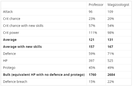 So Magizoologist have higher attack and higher bulk than professors. It doesn't matter we talk about basic power or critical hits - both of them are slightly higher. And bulk difference is even more notable.