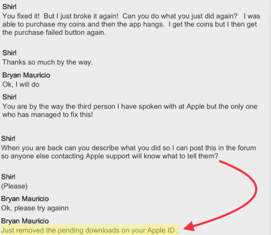 I thought I’d try Apple again and this time I finally got someone who was able to do as described by @Drakonite (thank you Drakonite!). It took me three different agents over the last two weeks! The first two said I had no pending downloads. The third one was able to help in minutes! I showed screenshots of the Reddit thread and Drakonite’s thread showing that this worked. Here is an except from my chat with the agent (Bryan Mauricio) in case it will help anyone else who encounters agents who say there is nothing pending download. I followed exactly what Drakonite said to do, the agent fixed it, I bought coins in HPWU, the app hung again and the agent fixed it again so I can now purchase items with my coins.