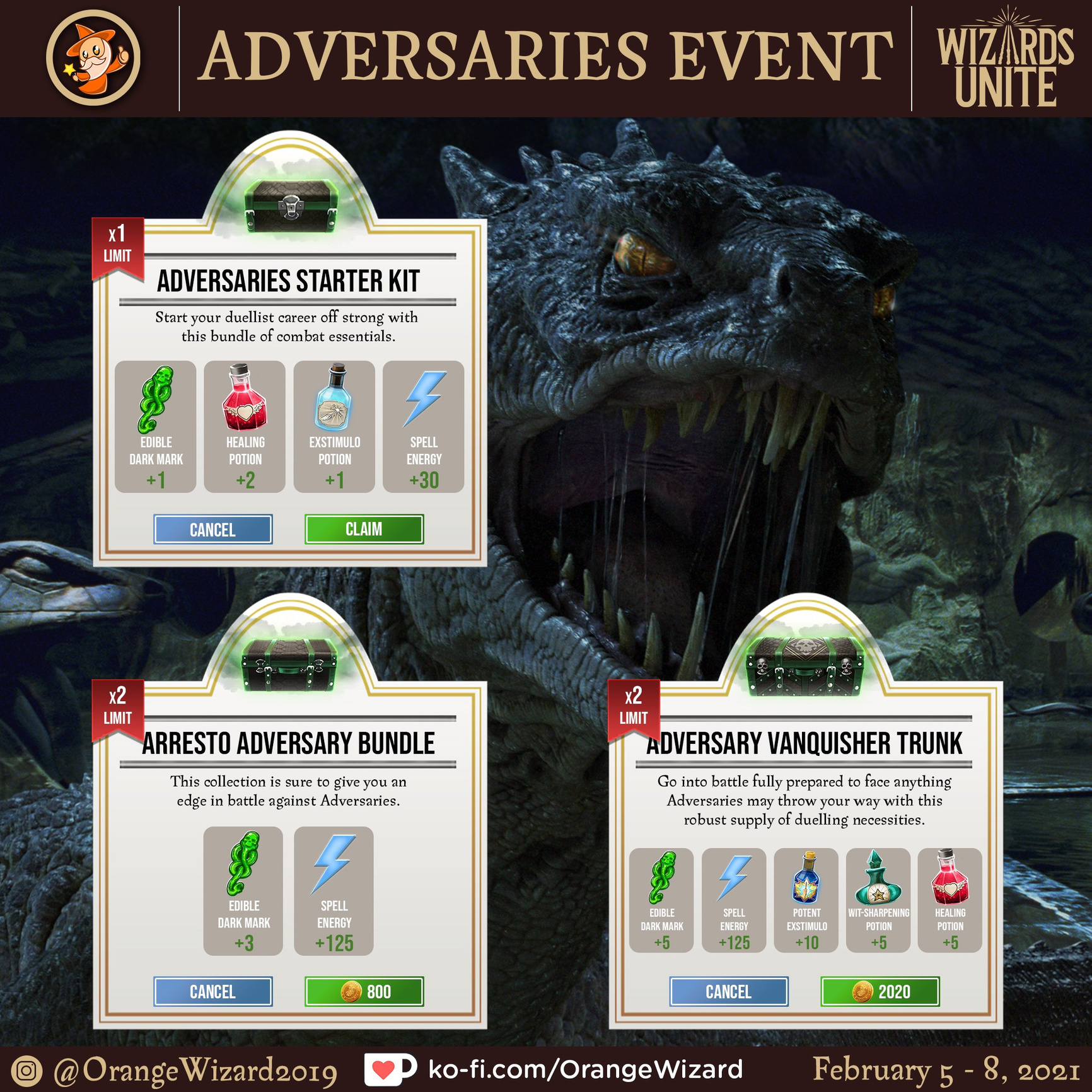 Wow 😊 This looks doable. I will have to hitch a ride with someone before this weekend so I can stock up on Snowdrops and Ginger Roots. I still have to brew a lot of Potent Exstimulo Potions and Wit-Sharpening Potions (even though I have been getting a lot of Wit-Sharpening Potion gifts, thanks to friends). I could just get the guards but I like the challenge of beating the Adversaries.
