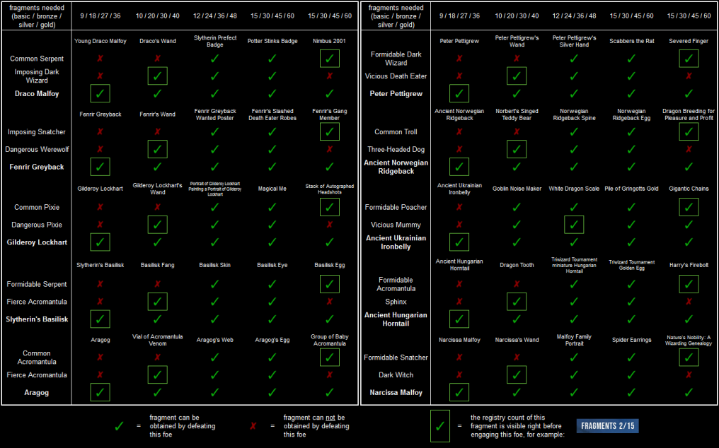 Is there anywhere/anything that has been created that shows the link of rewards to adversaries? Similar to the info graphics showing which foundables you are likely to find in each challenge chamber? I understand the major fragments on each page (ex. defeat Draco Malfoy, get a fragment), but what about the extra ones that seem to appear randomly? Like the Nimbus 2001, for example, of Draco's page. Is there anything to identify how and when that fragment drops? Just trying to be strategic in playing adversaries in the future since the amount of SE and potions isn't worth the rewards if I've maxed out a particular fragment with green stars.