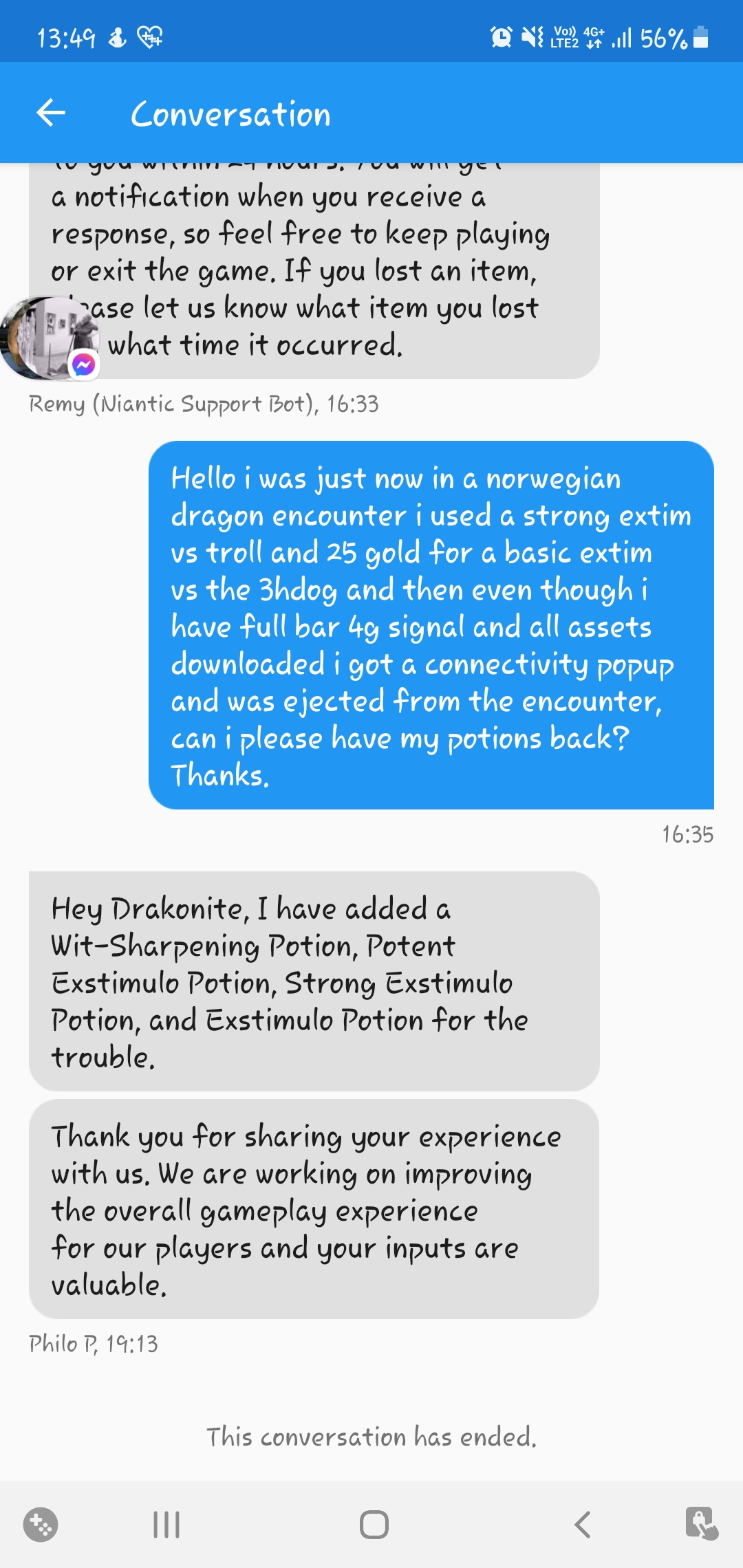 go items and purchases -> other and the bot will connect you to an actual person, then describe the problem and be sure to add that you are on a good 4g/wifi signal full bar etc and you have downloaded all assets and time you fought the adver and which potions you used etc