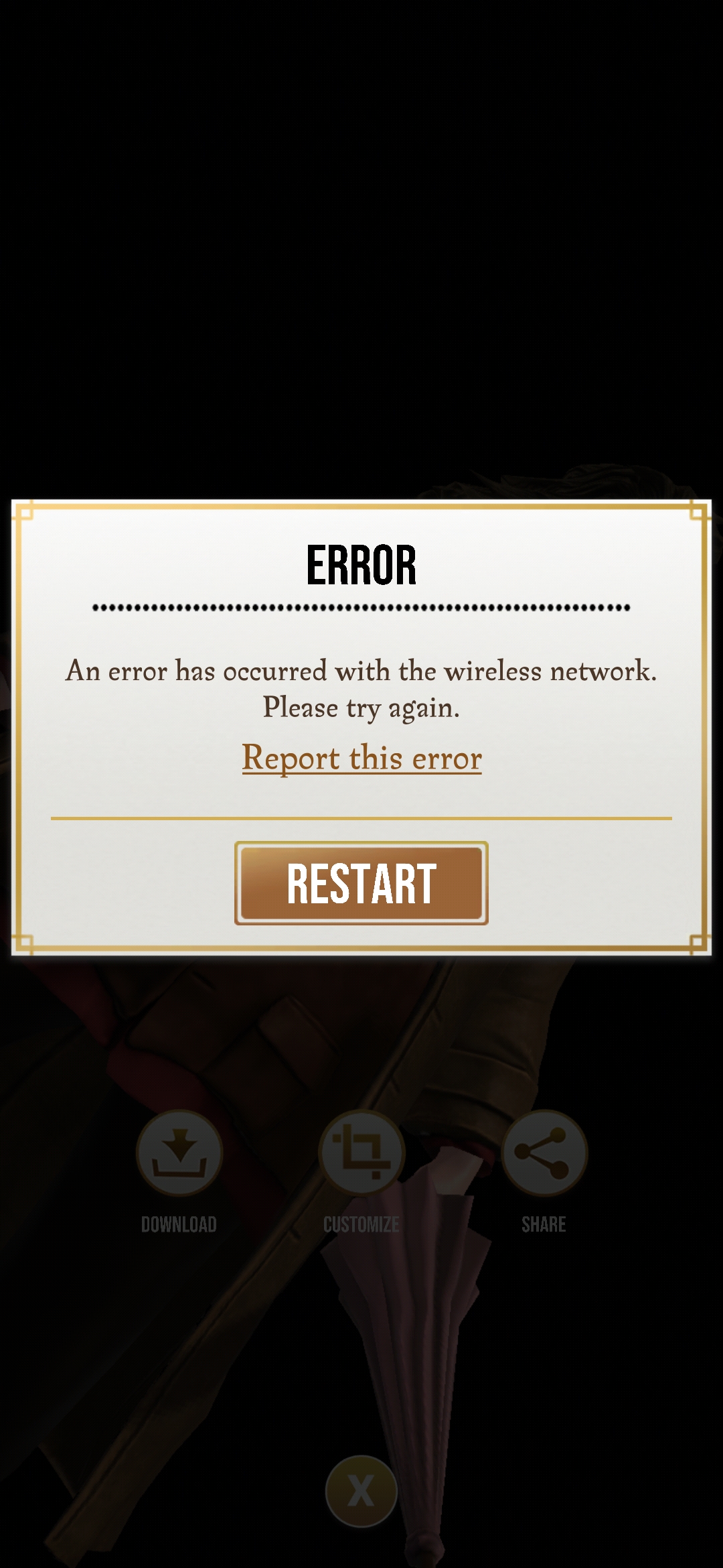 In game going to my registry and selecting a character to take a photo of when i press share its giving me a wireless network error and then i have to restart the game.