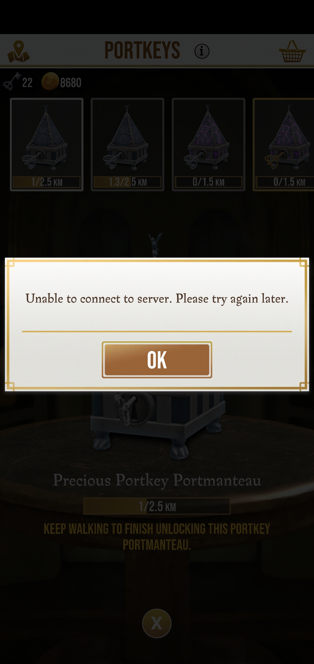 I'm having this problem too! Ever since that last update. And no matter how much walking I do they're not unlocking. I've got 0.9 of 1km completed on a portkey and it hasn't unlocked, despite me having walked over 4km today. It's also not registered on the daily tasks - it says I've walked 0.04 which is very frustrating. It also keeps telling me it cannot connect to the server.