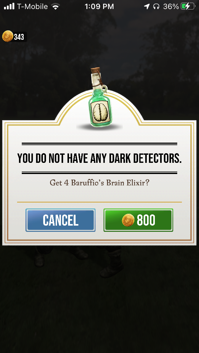 When I go to cast a spell for a regular or Brilliant foundable, the screen freezes and tells me I do not have any dark detectors and do I want to purchase some for 800 coins. I lost a potion and two trace charms only to be upsold for an item I have 2o of already.