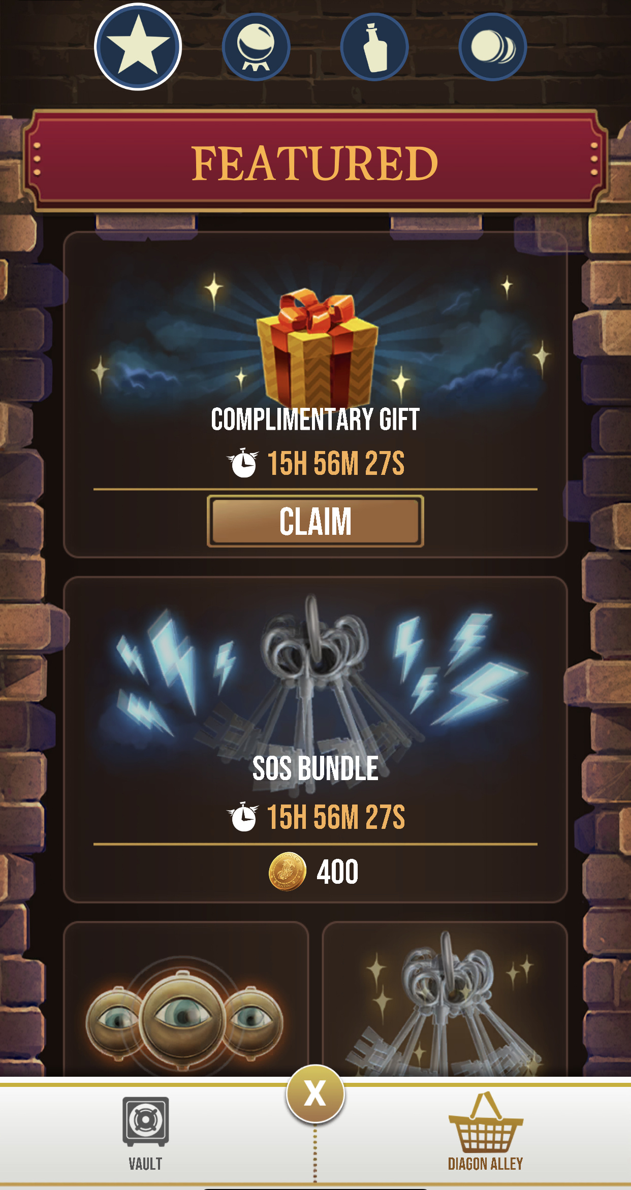 The complimentary gift is in Diagon Alley and there is a SOS Bundle for 400 Wizarding Gold.