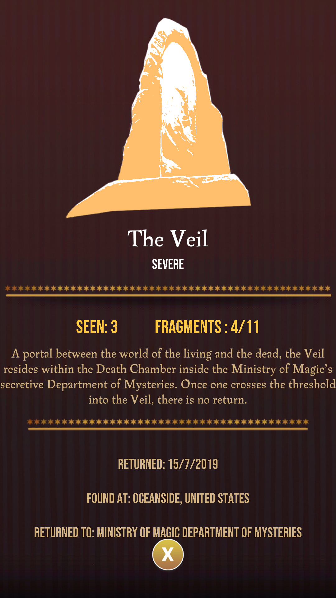 Hello fellow Aurors, Magizoologists , and Professors. I had an amazing find 2 days ago of a Foundable, with No registry location,that I currently have. ( Im a 31 Auror) . It was called " Security Troll is Guarding a Veil". Thats right.... like the one Sirius got into by mistake. Sorry, I was so excited I forgot to screenshot it. And lost it nonetheless, using a Potent Exstimulo potion and Great level traces.