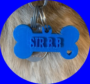 His name is "Sir Bandit Bear" aka "Sir B.B." I made him this name tag on the 3D printer in Blue: