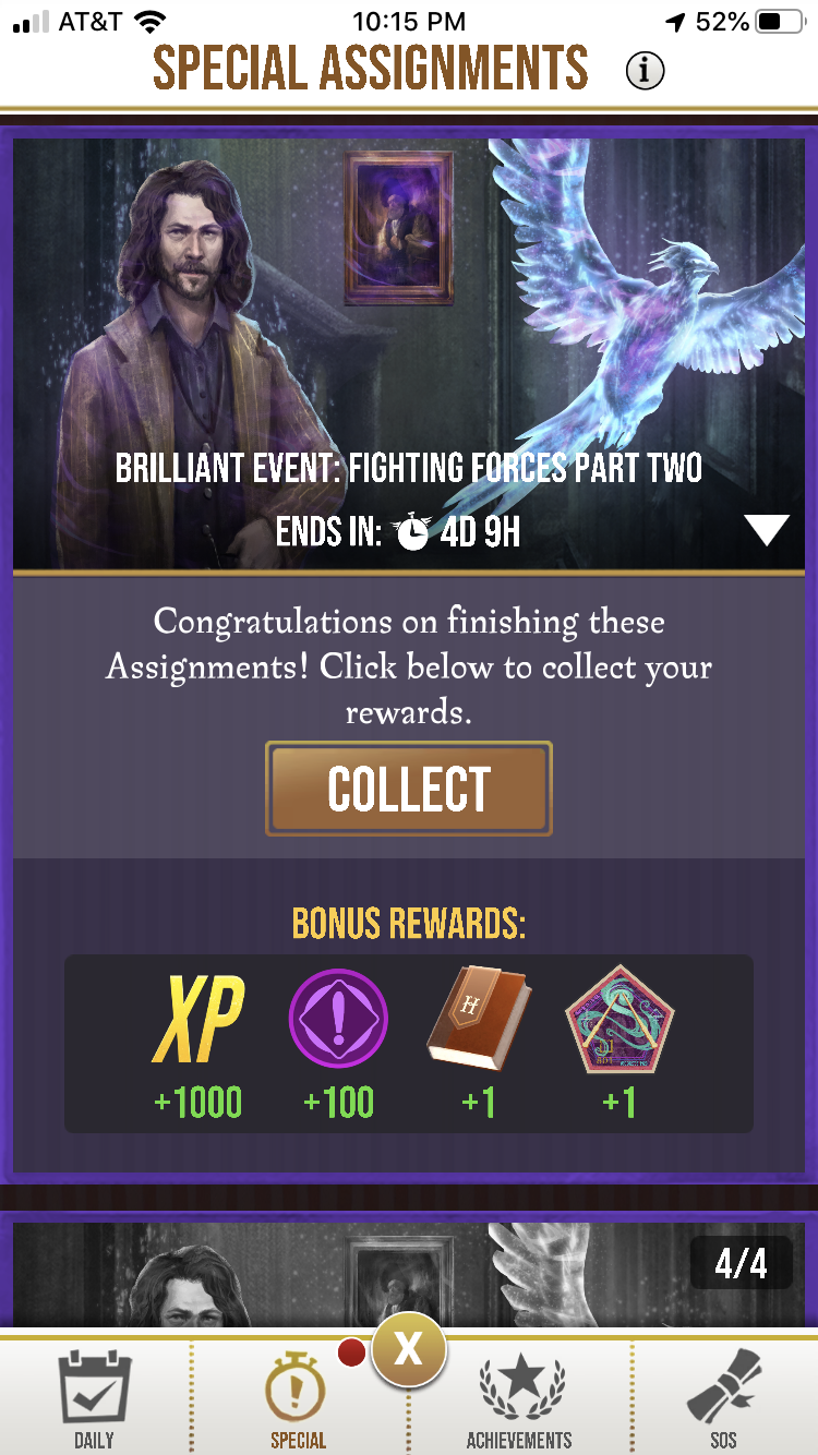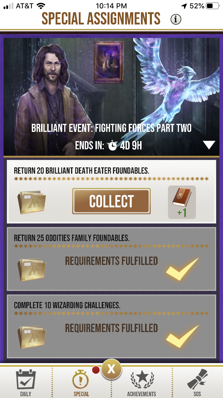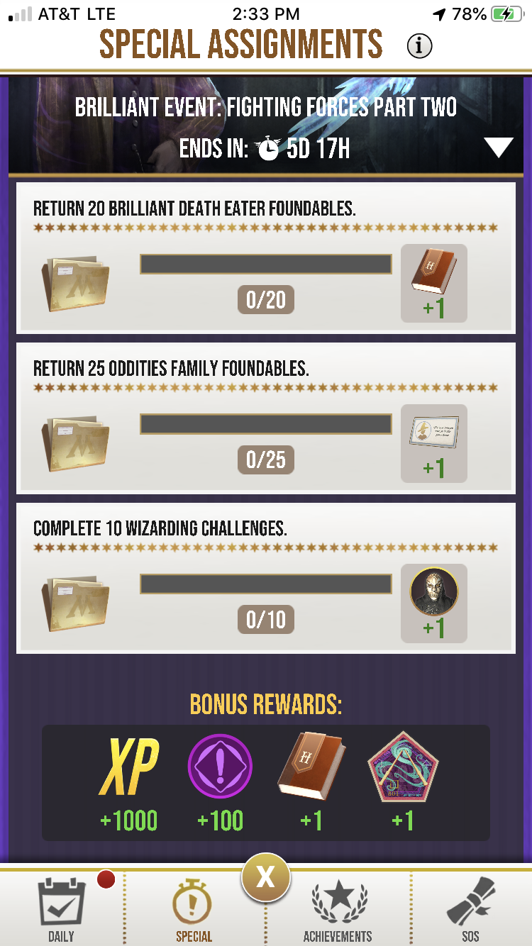 the week2 guide linked above has been updated (corrected) - as above screenshot shows, one assignment is to get 20, not 10 as was originally reported, brilliant death eaters (and thereby earn a red spell book), and the overall rewards for completing all three bonus assignments now includes yet a second red spell book (which was not part of overall rewards as originally reported)