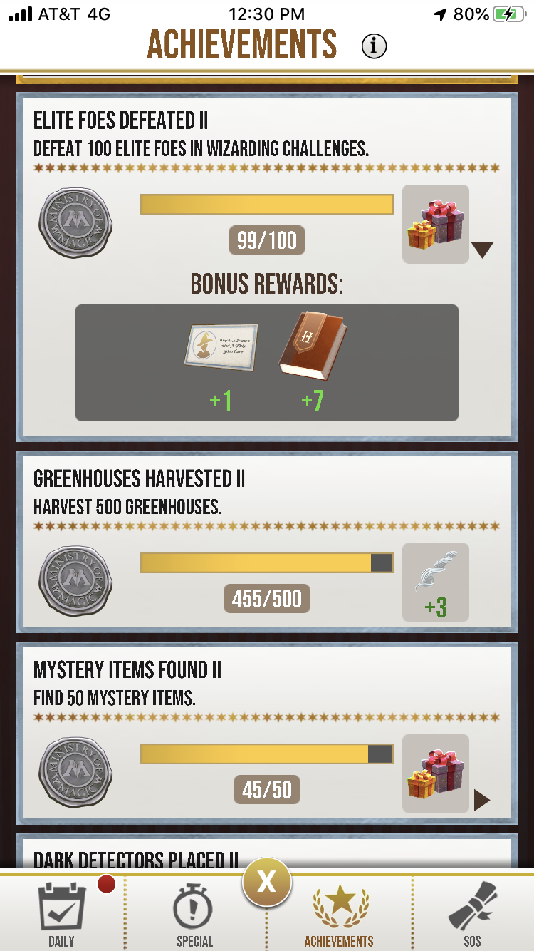 @HPWULola - only possible/feasible because every basilisk is elite and so easy to find (in sponsored fortress and/or with higher level dark arts runestones) and defeat (248 hit point no matter which level runestone used, so i can 2-hit each one and get back same 2 spell energy i spent as reward from sponsored fortress). soooo, big thanks to y’all @HPWUTeam for making this achievement a bit easier to reach. i started yesterday at either 66/100 or 67/100 and ended where i am now at 84/100, and that was when i was using the level 1 runestones for **** for the dark arts fortress fragments. today i am going to stack the deck for calling the basilisks by using level 2 or higher runestones in the HHchamber.