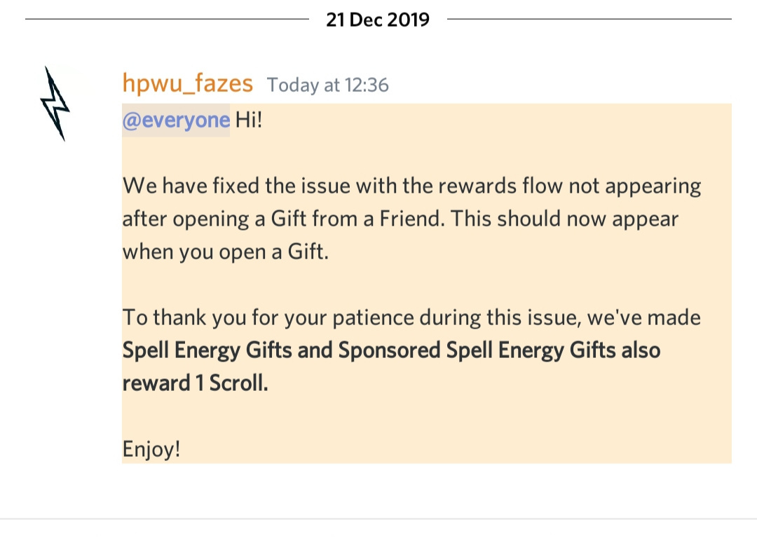 Oh and @kiheikid what I was asking is when the gifting in general will be ending. It started in November before Thanksgiving and I thought I had read it was for the Christmas season. So if that is true would gifting in general end on January 7, 2020? I know they said that the gifts would be ours forever so we will have the ability to open them at some point. Which since we have the ability to send 100 a day but only open 10 it created a bit of a bottleneck so it would take me like two weeks to get all my gifts opened. 🎁 Honestly I seriously hope that gifting never goes away as of course the gifts are nice and have really helped me as I really need more runes and that has and will remain my priority but what I love the most is the postcards from the POI’s across the world. That is so magical everyday to get to open. Lastly, gifting brought another level of player engagement to the game so I am so appreciative! I know it has been a bit of a nightmare for the HPWU team but hopefully the gifting will remain a permanent thing for us.