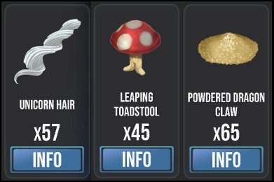 While it goes without saying that the extravagant gifts are fun to send/receive, I'm also a pretty big fan of the Exstimulo and Baruffio's Ingredient gifts with holiday bonus. I'm always happy to make room in my vault for more unicorn hair, powdered dragon claw, or shrooms.