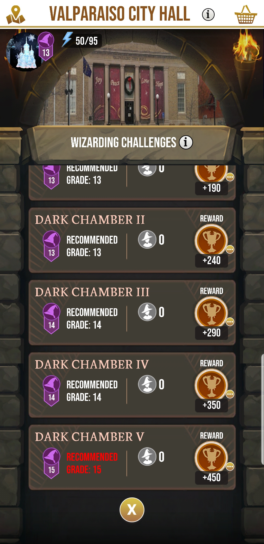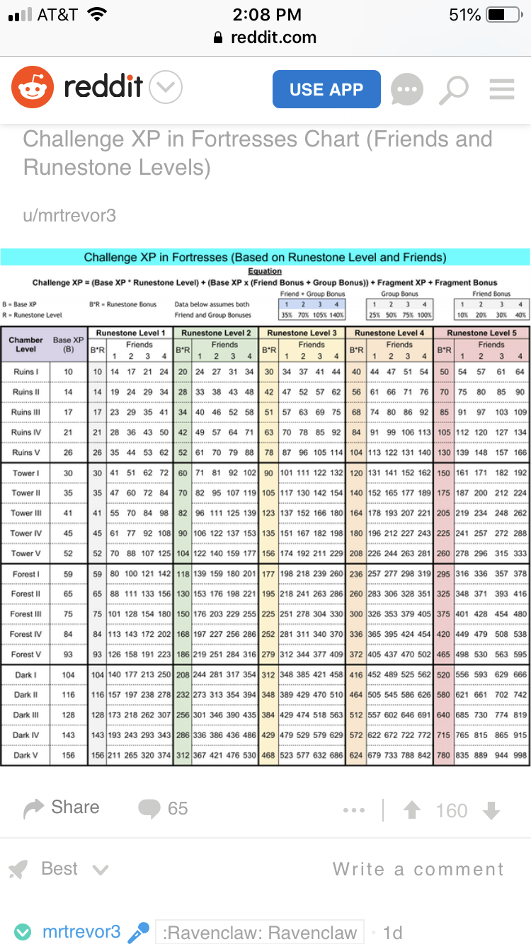 ...will want to find a sweet spot within the fortress chamber levels that optimizes time spent for fewest resources used but best challenge xp amounts rewarded, and then fine-tune adjustments with best runestone levels availableI agree. My fortress battles are directly proportional to my potion supply. I generally bounce back and forth between the hardest chamber I can handle with a good supply of potions and the hardest chamber I can manage without using any potions giving me time to restock without taking a break between battles to do so. With that being said, I seem to get the best bang for my buck by focusing on Ruins 5, Tower 5 and Forest 5 using no. 4 runestones. I save no. 5 runestones for Dark Chambers.