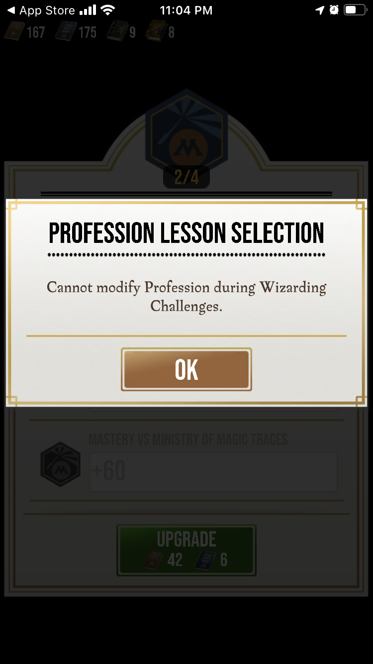 also, when I tried to complete a profession lesson, I got the message “Cannot modify Profession during Wizarding Challenges”. Presumably the game still thinks I’m in the challenge I was booted out of.
