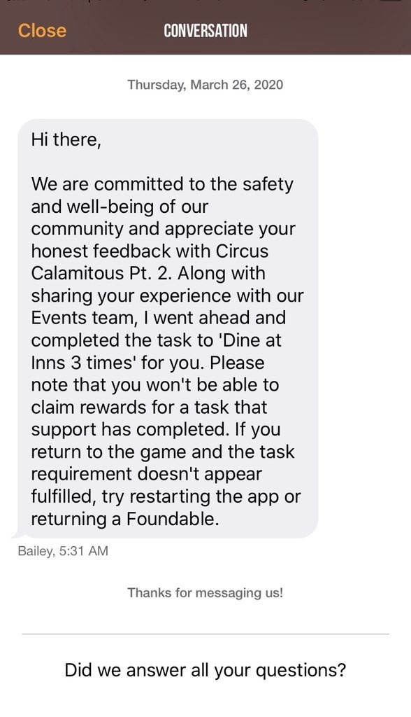 Hi @eeyoremoo. We all understand your dilemma. Apparently they tried to have that task swapped out but were unable to. Could be a contractual thing, not sure. Anyway, many places allow people out for essential things like to exercise or to buy groceries. Perhaps if that’s a safe option for you, you could hit some inns along the way? Just do what it safest for you, and don’t worry about the game. If you can get to the inns, great. If not, health is more important.