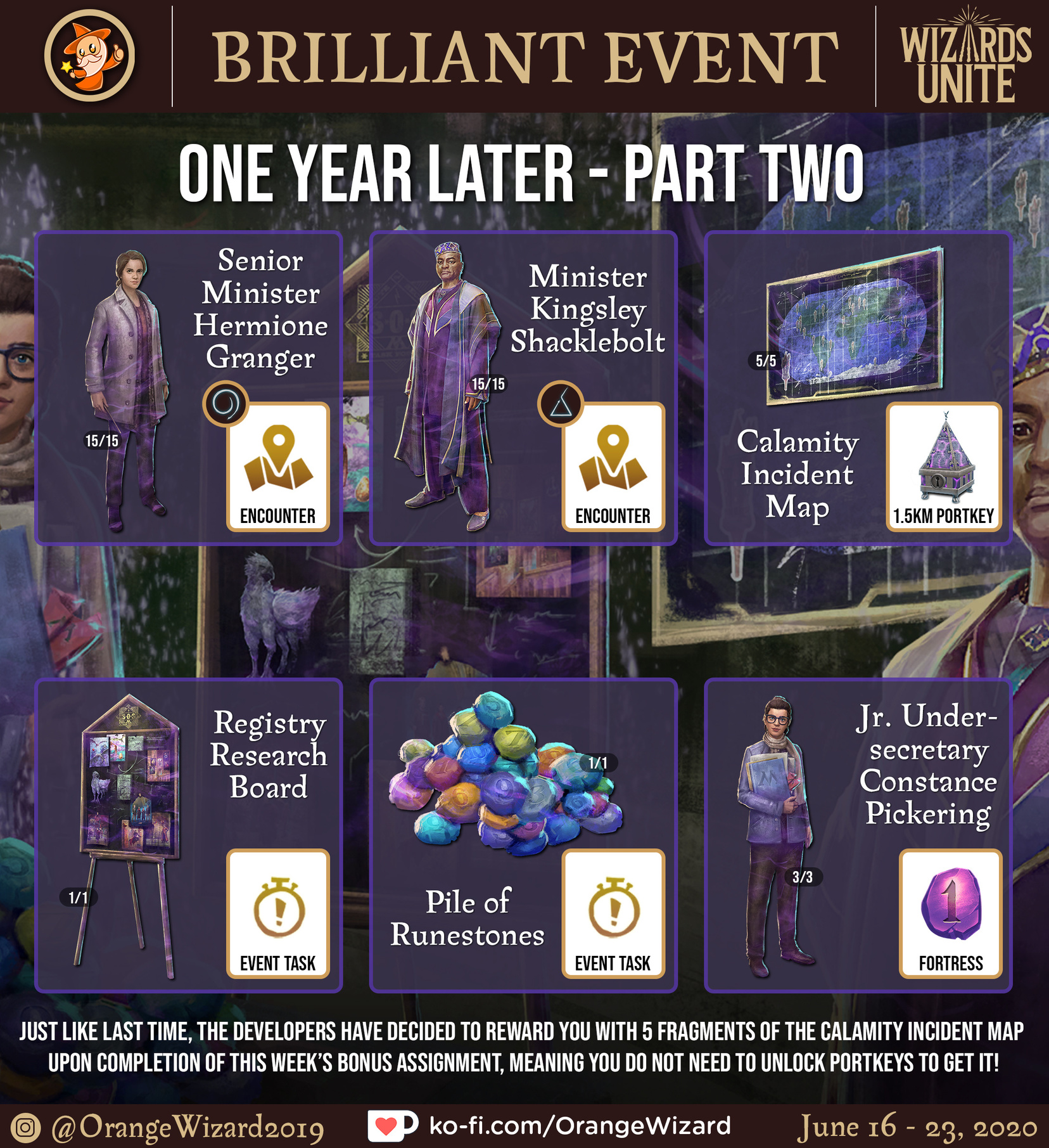 The tasks looks interesting, there is wining in your highest chamber again, and picking ingridients/portkeys up tasks. Also defeating formidable foes is also interesting. Winning one runestone looks easy (Just collect 10 brilliant points.). Using runestones,winning foundables from challenges and defeating 20 foes (Ruins chambers could be useful.) are interesting too. Also 6 spell books are good too. The sticker is Wizards Unite version of Harry's birthday cake, which is awesome.