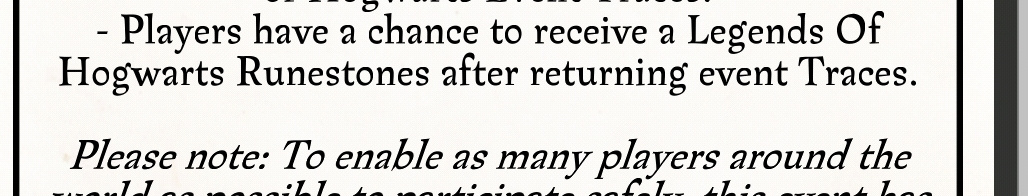 - Players have a chance to receive a Legends of Hogwarts Runestone after returning event Traces.