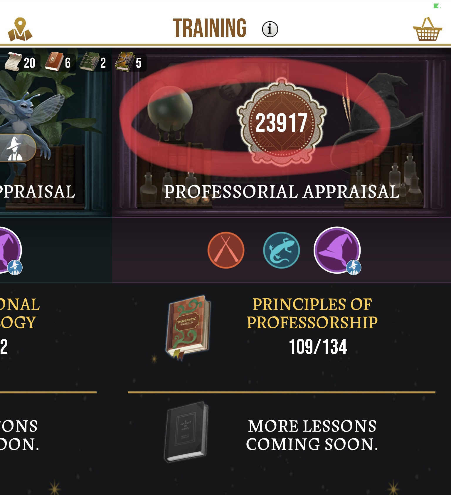 THEN, THE NEW UPDATE ARRIVED TO INCLUDE SOS TRAINING. Unfortunately, my Combat Training Appraisals dropped once more again (Auror-26026; Magizoologist-26339 ; Professor-23917). Wait, what? I also started to notice that each of my Combat Training Appraisals would periodically show lower numbers (well below 20000!!!). Seriously now, what is going on?!?! As with most glitches, I found what seemed to be a temporary fix by switching from the current profession, to another, and then back, and the appraisal numbers would seemingly correct themselves.
