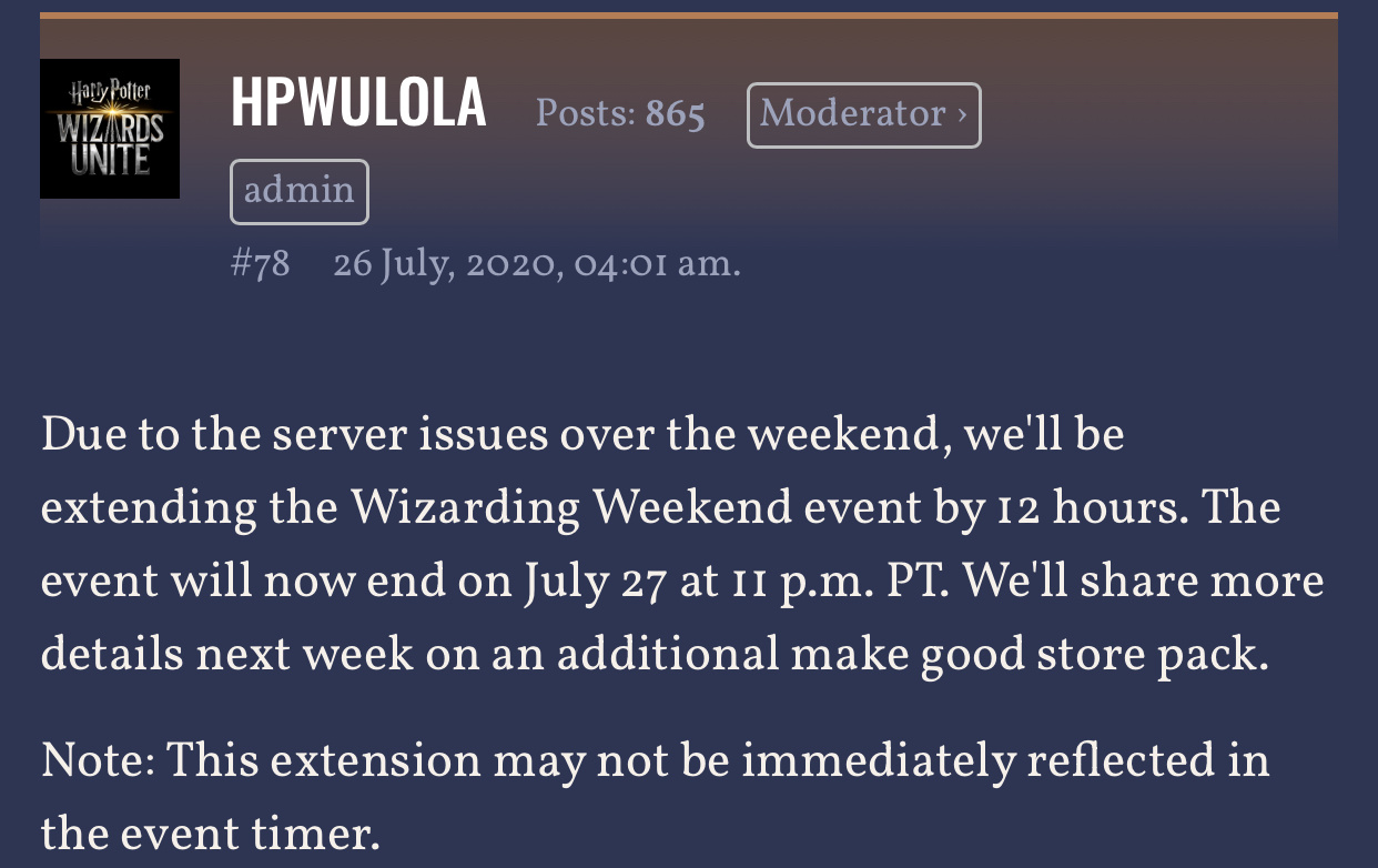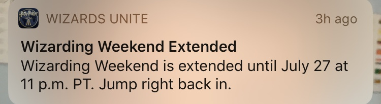 Please help us out and extend the event; it might have been ideal for niantic to know that on the same weekend as this event they were also running a pokeman event that was going to be attended by a lot of players; perhaps they could have sold advance tickets to the pokeman event so they would have known that their servers might be quite busy? Anyway please help us helpless potterheads out