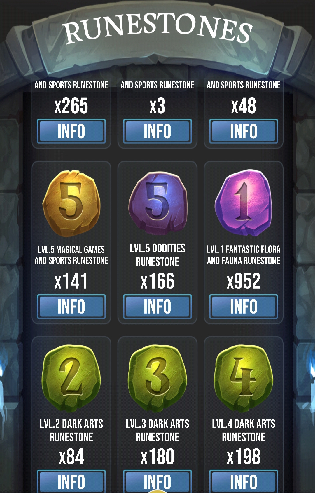 I have close to 500 runestones, excluding the BE runestones. I already got rid of all the level 1 and 2 runestones so the 500 that I have, are just the level 3, 4 and 5 runestones. I'm working hard to get the number down but at best I can keep it steady, most of the time it still goes up.