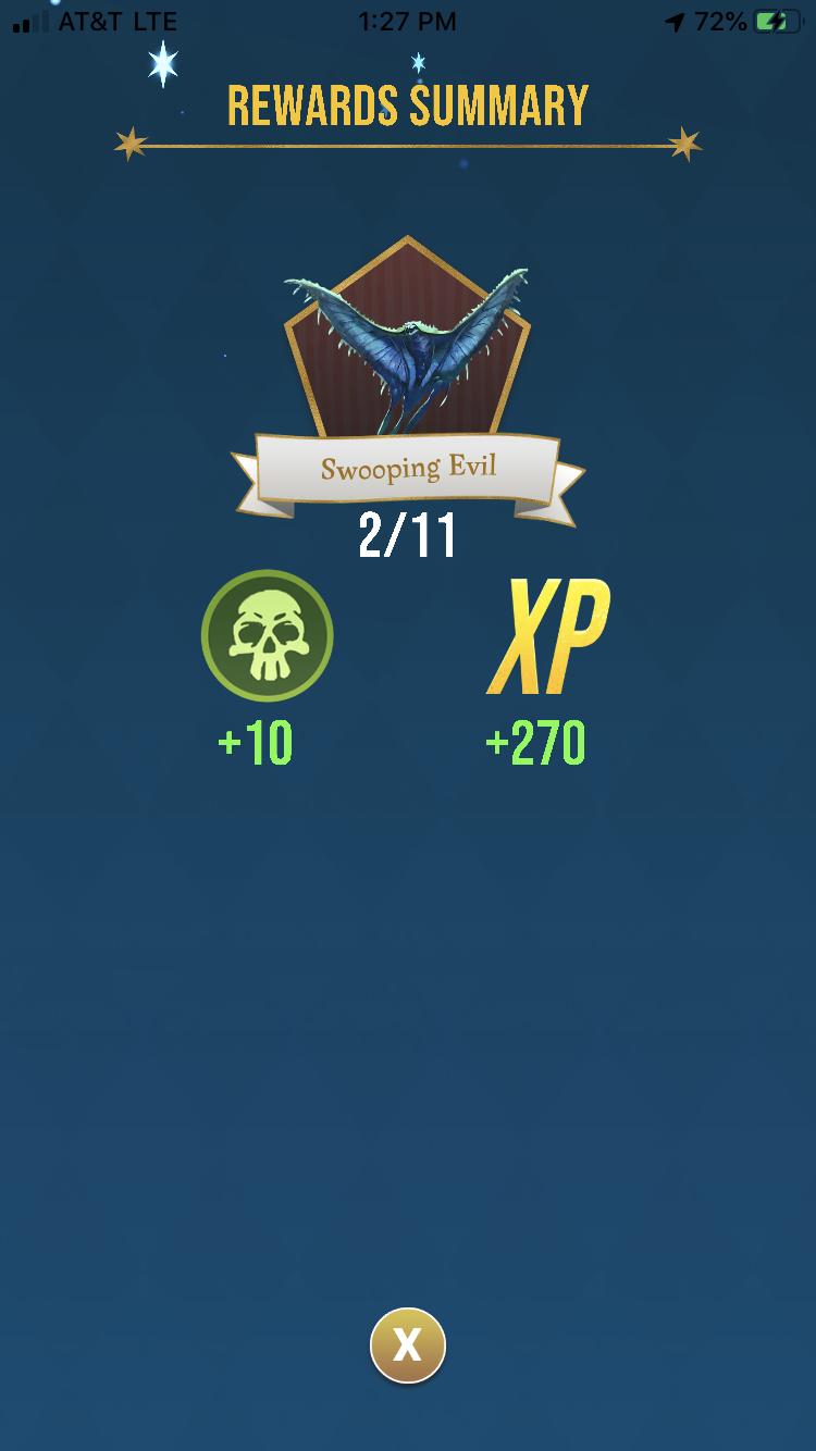 @Herm10neG92 Ooooh you had to bring that up eh? 'The Chosen One' (wizard wifey) stopped telling me when she encounters Fawkes; see image and you can see why. Mrs. I-don't-have-a-red-dot-on-my-phone appears to be well loved by the Niantician Gods. Personally, I don't mind, a happy wife is a happy life. Grats on having a great day! As for notable returns, completed my first Forest 5 chamber recently and received a pair of Wizengamot Accusation Chair fragments. I also recently received Moody's Sneakoscope and Probity Probe fragments. Nothing of note from the map though, other than needing one more fragment each for Rowena and Godric.