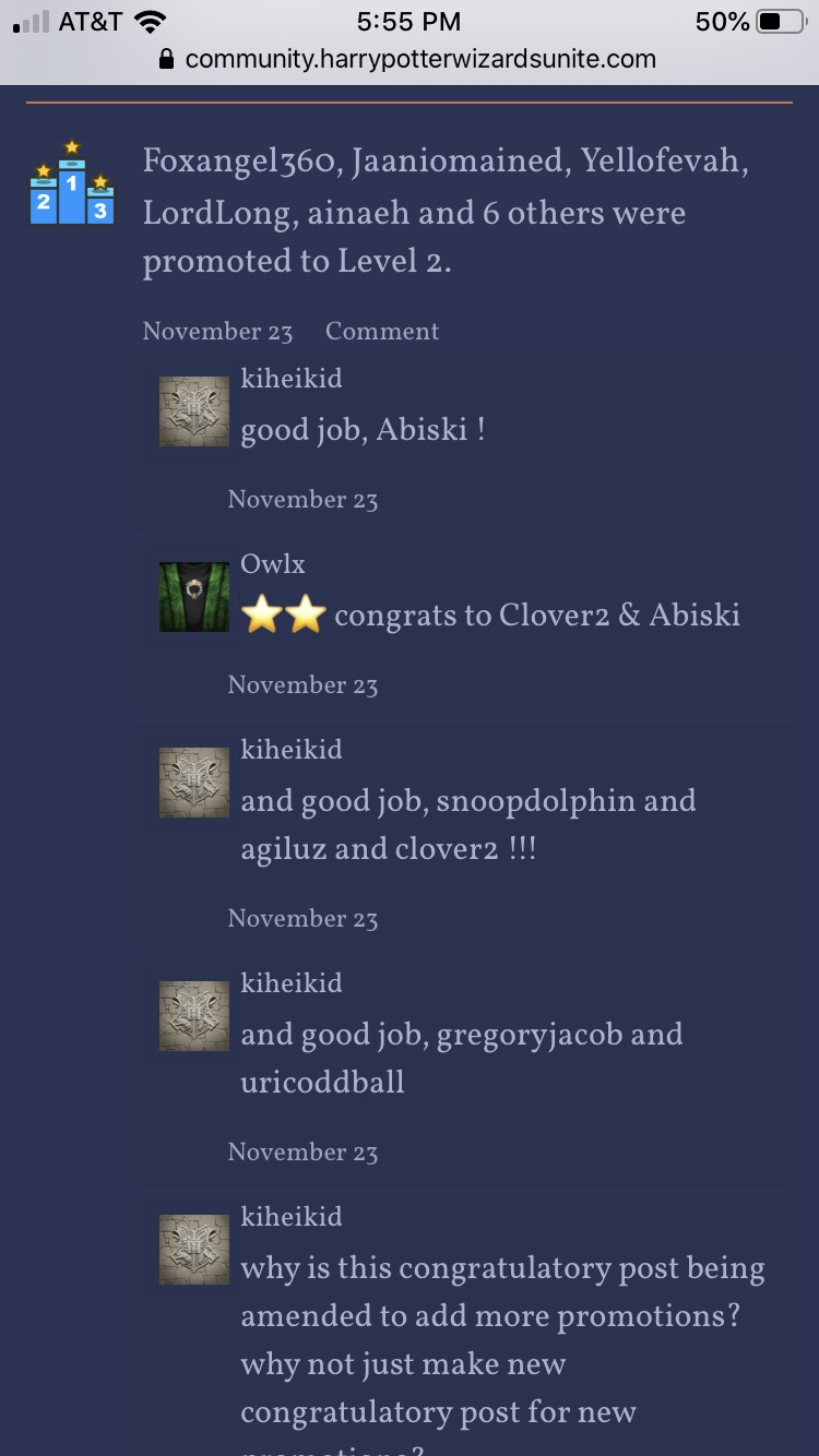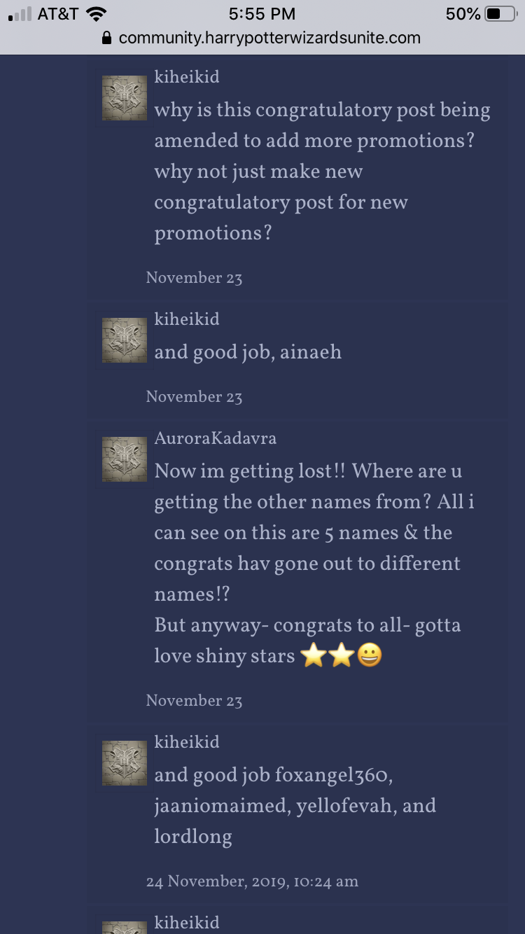 i’m just bringing this issue to the attention of @HPWUTeam and @HPWULola that what they might think is honoring and recognizing everyone being promoted is actually only honoring and recognizing the very last 5 people they list because everyone else they think is being mentioned in fact falls into the black hole of “and others”. if they intended that, then shame on them. and if they did not intend that, then there is an easy fix - manually mention the newly promoted in groups of no more than 5 per post, or turn off the bot doing this until it can be done properly.