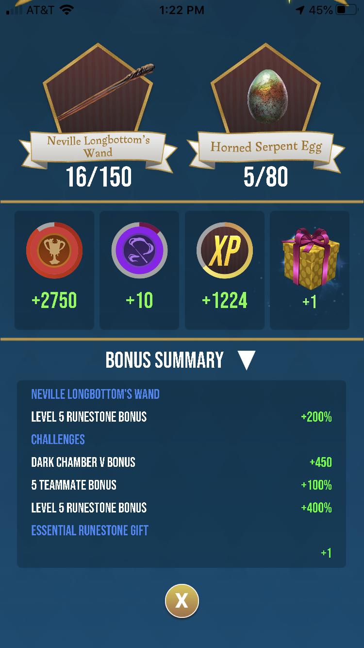 I just did a dark 5 with PPAMM and we had several elite foes so I hit up the first spider and then cast the Bravery charm which cost me 7 focus. I then hit up and am irkling and with zero focus it took me forever to take that suck er down. I did my five and there were four foes left to go and two people weren’t engaging for whatever reason And the clock was ticking so I had to take on a dark wizard. So i used a potent and took him down. I got 3k WXP but it was my first dark chamber that didn’t go what I Would have thought of as smoothly. Maybe I shouldn’t have cast my bravery charm that early. I don’t know what I would have done differently. No one was knocked out and the auror/professor did protect me where I wasn’t taking any hit points. But we did have a ton of massive elites. So it was a learning curve for me.