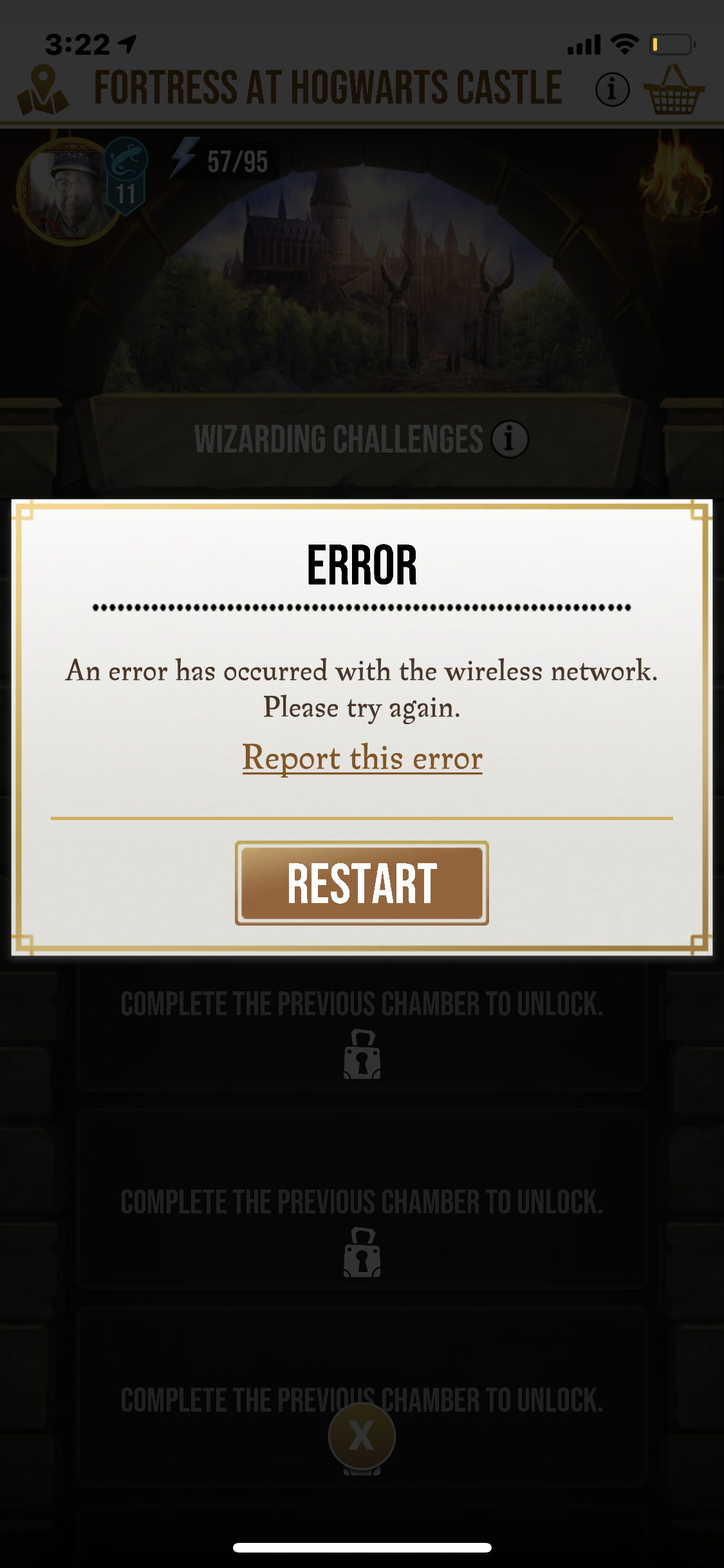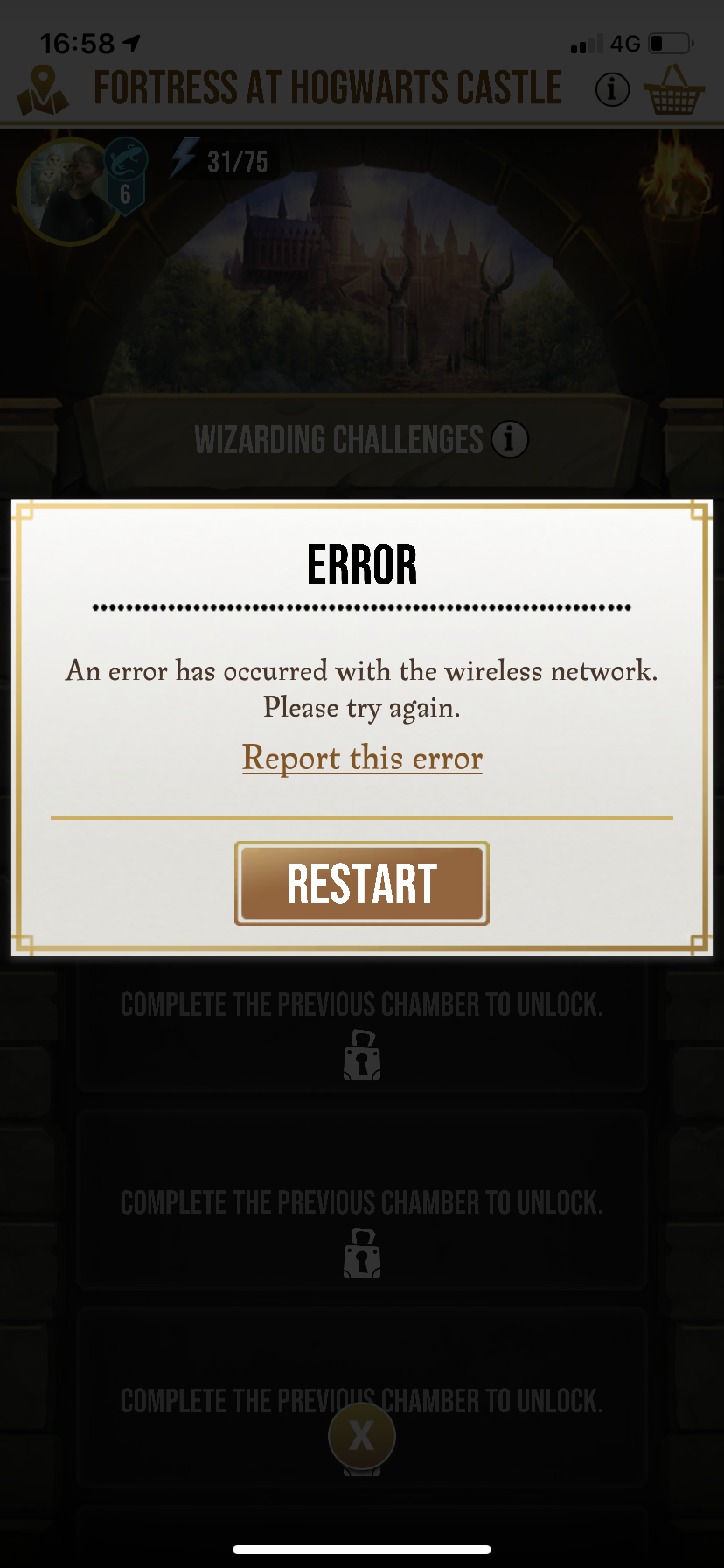For the past 3 months or so I cannot enter any fortresses it just pops up with Harry’s fortress explanation and then says network error the minute I try and enter a chamber! I have deleted and redownloaded the game 4 times and still nothing, can’t complete anything and it’s starting to make me consider deleting the game which is a shame as I really enjoy playing it!