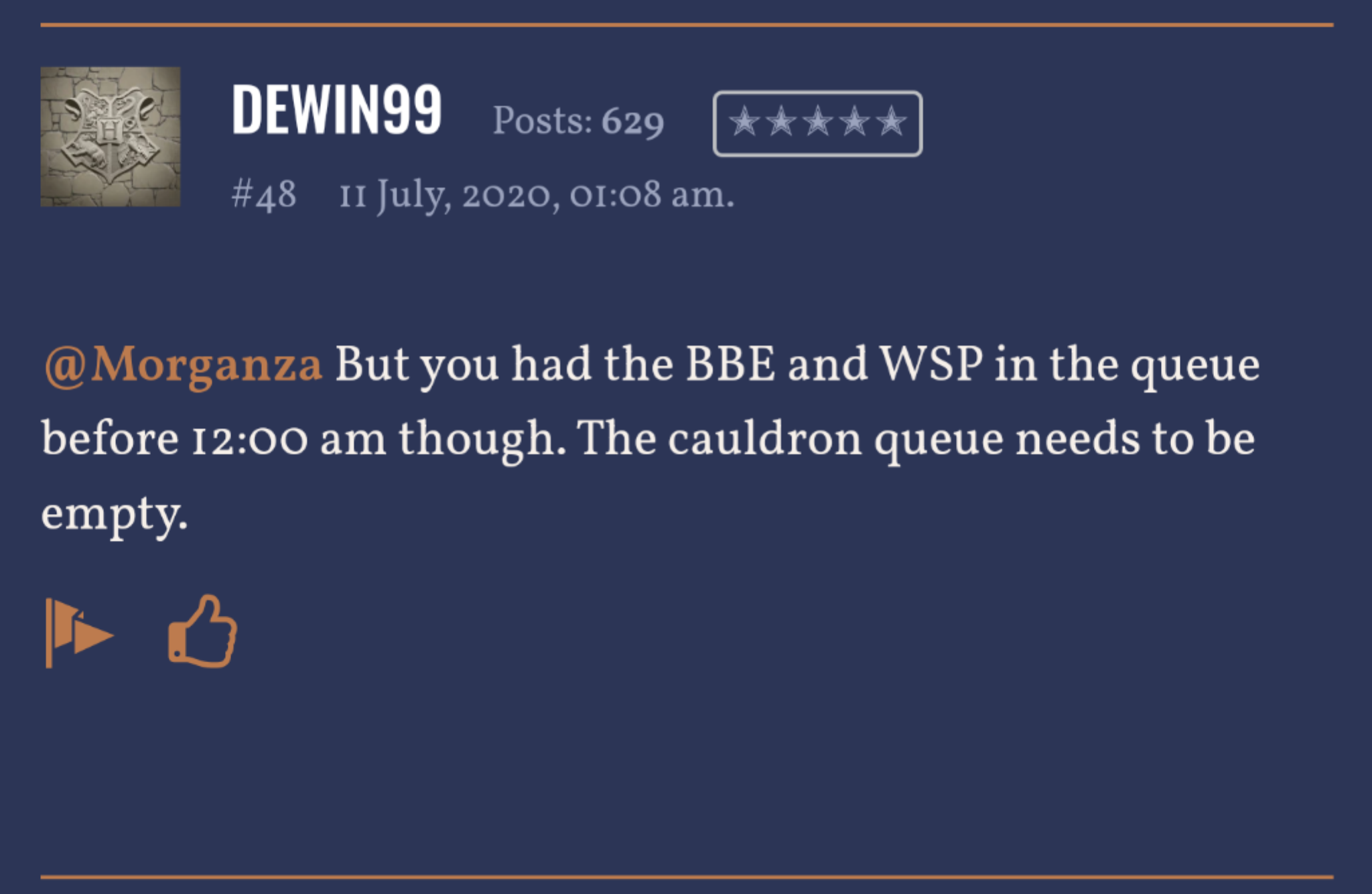 @Morganza But you had the BBE and WSP in the queue before 12:00 am though. The cauldron queue needs to be empty.