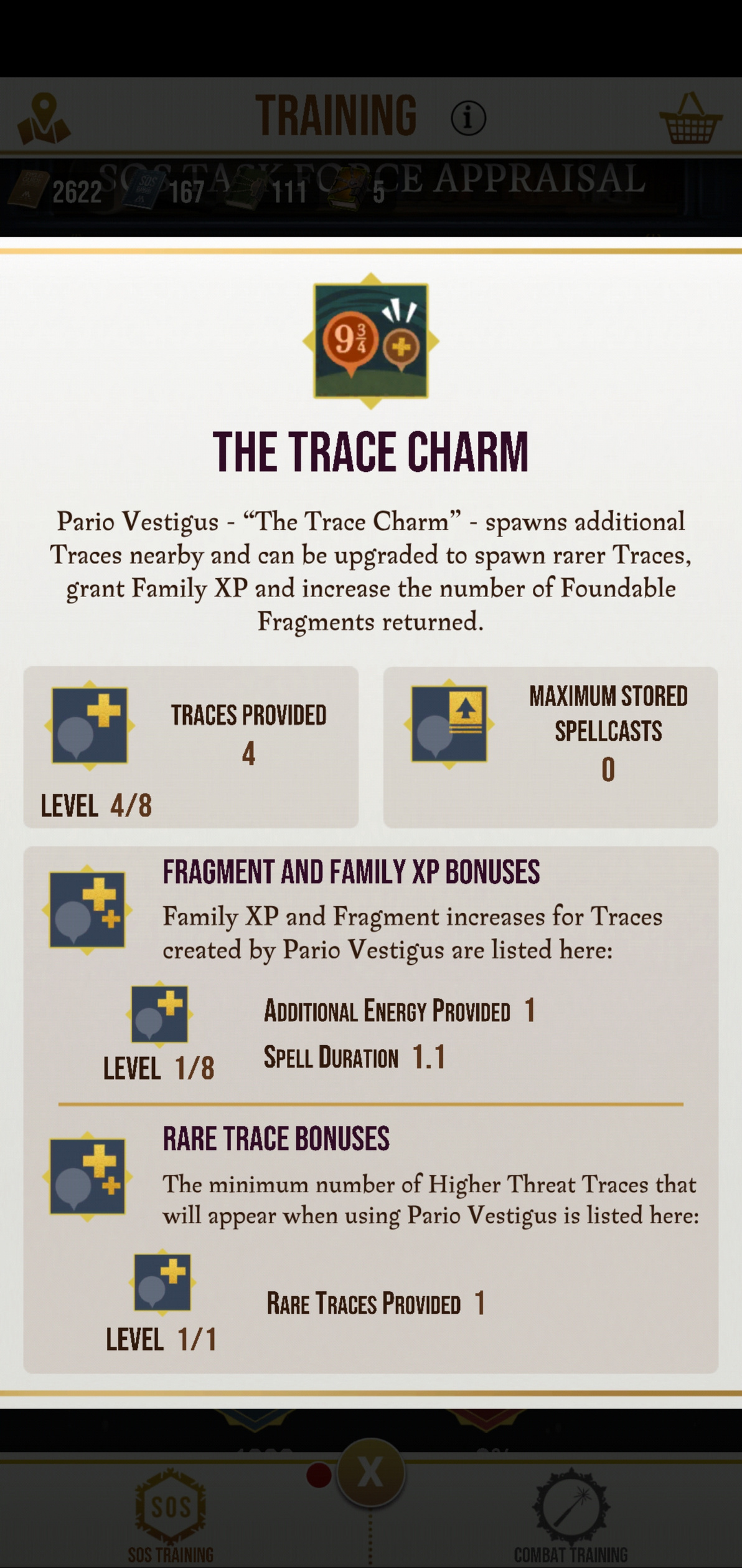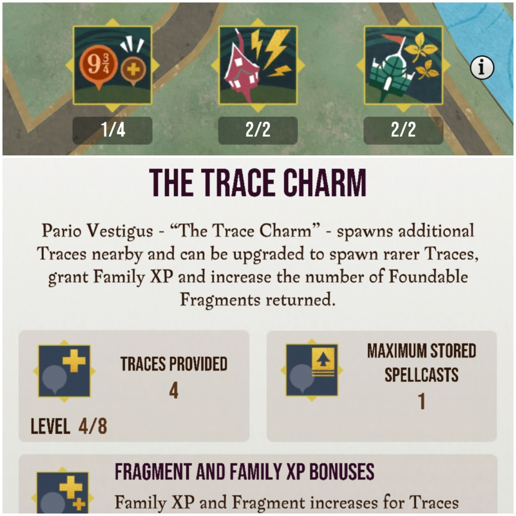 --- When you look at the Trace Charm in the Magicum Vitae, it has the words "Additional Energy Provided" instead of "Additional Fragments Provided" and it has the words "Spell Duration" instead of "Additional Family XP"
