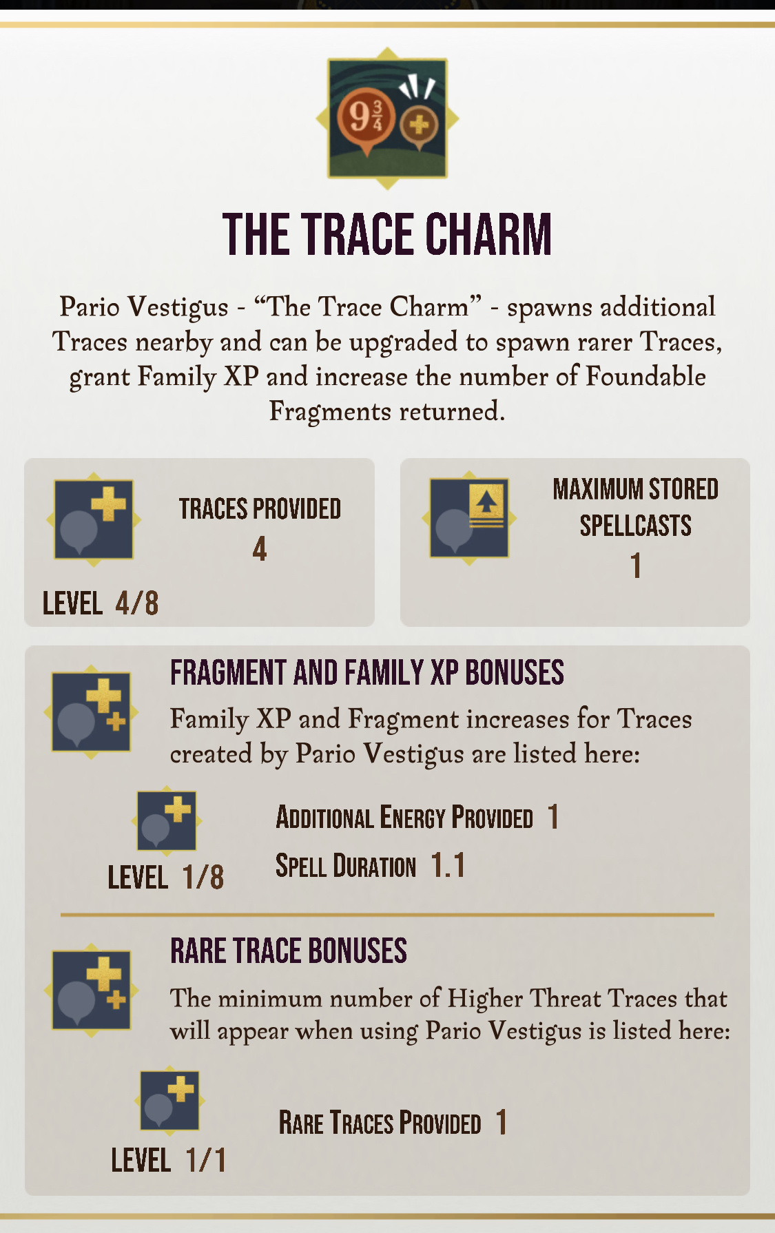 The most important asset added into SOS training is the “Pario Vestige” or the trace charm, but Proficiency is bugged and we have no idea on the plans on how the team is going to fix it and thus are all hesitant to even advance SOS Training even if we weren’t DADA gated. I mean... it’s probably the bottom of the list in importance, but how is the explanation of the Trace Charm still showing up with Greenhouse Charm details “spells provided”. The Trace Charm is infinitely more impactful for players