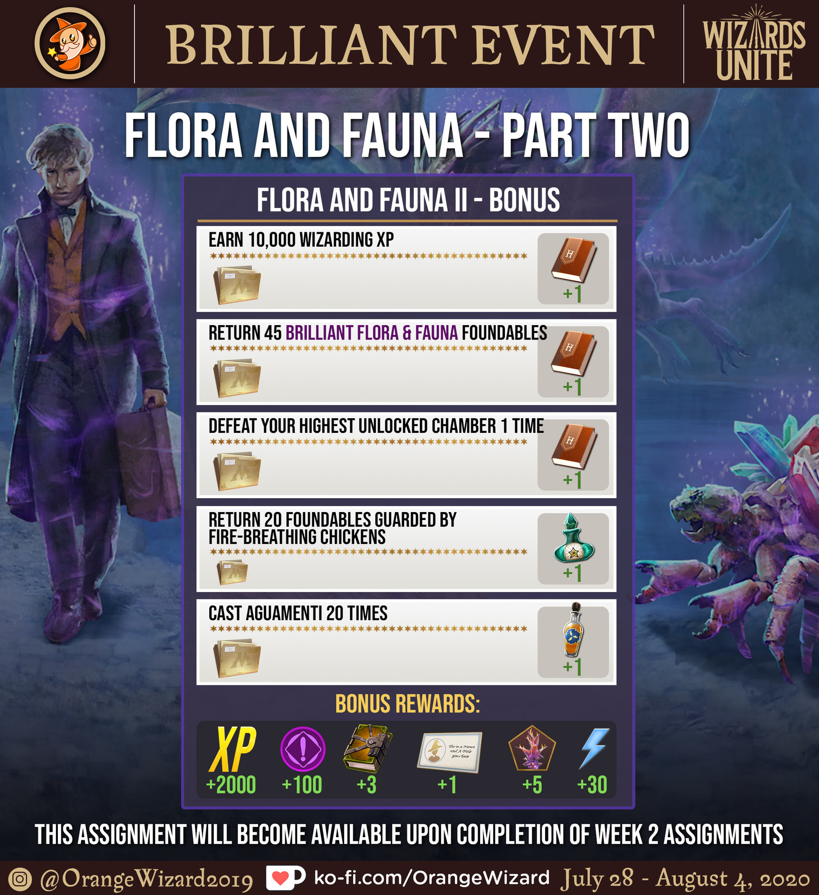 10k wizarding xp, 45 BE foundables, complete 1 highest chamber, 20 fire breathing chickens and 20 augumenti spells.