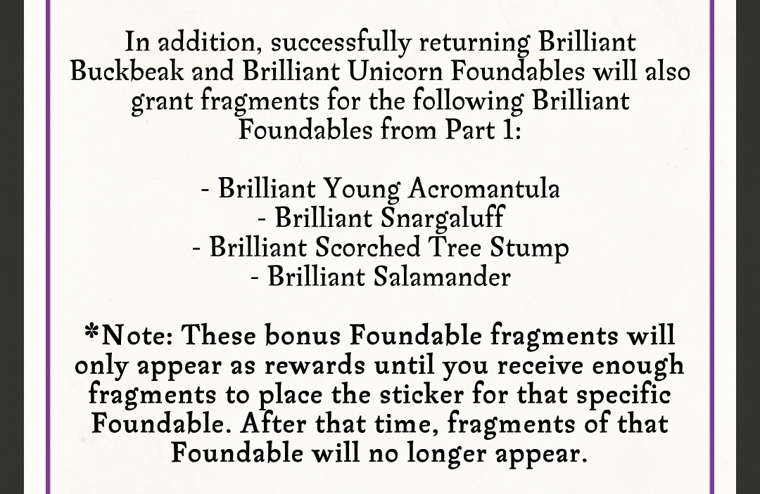A Brilliant Event: Fantastic Flora & Fauna collection fragment that isn't completed is supposed to be granted when I successfully return a Brilliant Buckbeak or Brilliant Unicorn. I've managed to collect every Foundable fragment in that collection except for the 2 needed for the Brilliant Young Acromantula (I collected only one of this fragment from the first time it was introduced to the game). Despite placing the Salamander fragment many times, I keep getting only Salamander fragments instead of the Acromantula fragments, even though that's not supposed to happen.