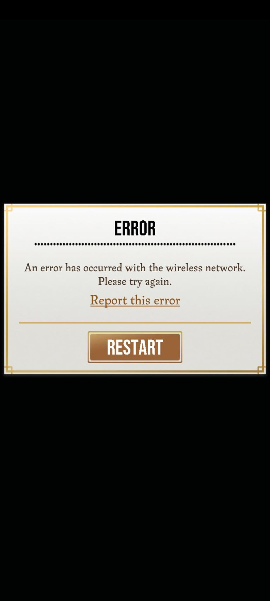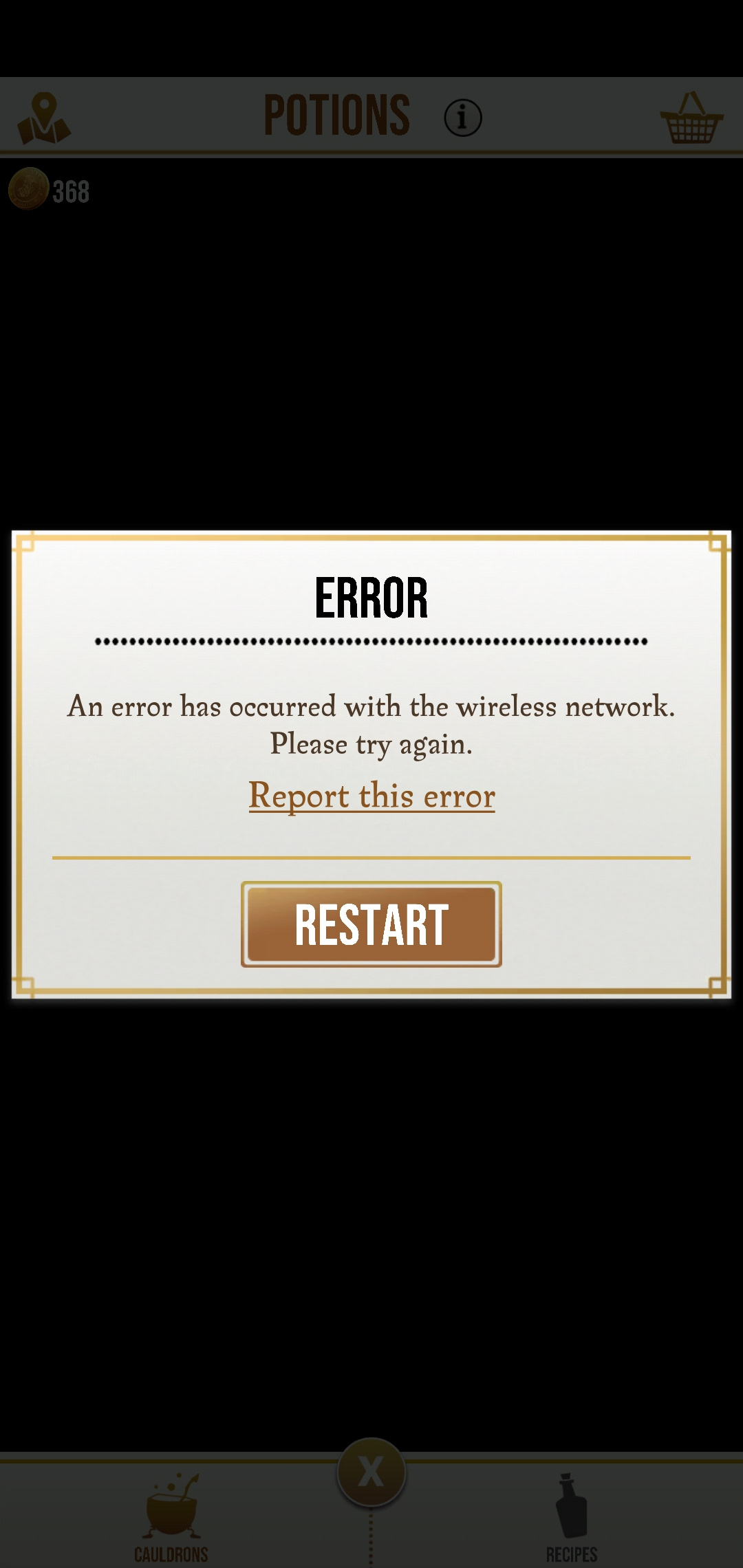 Tonight I loaded my game by tapping a "Potion Finished" notification. Sometimes this causes interface problems for me, such as not being able to exit the brewing screen etc. I proceeded to get stuck in the potions menu, so I restarted my game. To my horror, I got what I think is a similar bug to the Knight Bus loading bug where I get endless Error messages saying "An error has occurred with the wireless network. Please try again." Cleared cache and Data (on Android) to no effect. Just tried mobile data and nope.