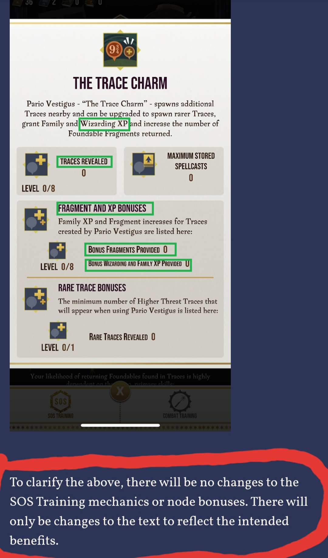 I loved the way the trace charm was working while it was “malfunctioning” and am sad to see it change. That being said, I DO understand the logic behind the change. The dragon week is a lovely apology and I am very much looking forward to it. Ultimately though, people will not be happy with only that. Even throwing some free Restricted section and DA books at us will not wash away the damage done by how much we spent to improve our trace charms and now regret. In my opinion, the best way to address this change would be to give everyone a free “reset” chit. Let me clear ALL the SOS training I’ve done so far and re-allocate the resources I spent toward what are the more valuable features.
