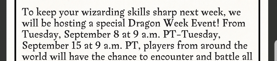Nice to have a Dragons week BUT there's a lot of eggs needed to prestige pages and this eggs coming only from portmanteau is going to be hard, would had been more awesome if you could get this eggs from battles too since is not safe to be walking around at least not where I am from, we have Covid and now is not safe because of all the ash falling from fires closed by.