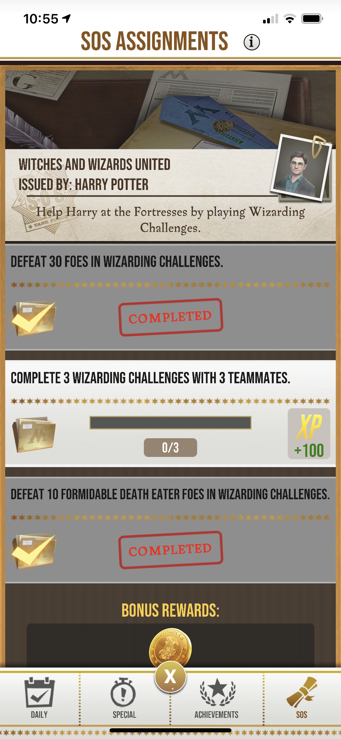 This has been the same for so many months, I don't even remember when I finally got to this level. Complete 3 wizarding challenges should be changed or removed.