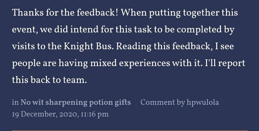Most of the threads in other areas talking about this issue have been removed, including the one where @hpwulola said that this task was intended to be completable by getting the gifts from the Knight Bus.