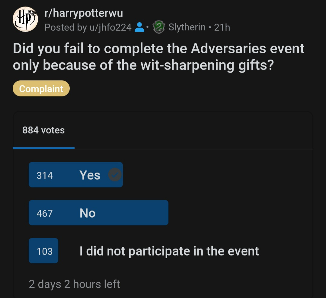 When are we going to be compensated for the dumpster fire that this event was? I, like many other players, didn't complete the event only because of the wit-sharpening gift rewards. We deserve to get the rewards from the event. I even ran a poll in Reddit to see how many other people were screwed over. HUNDREDS of players just from my small sample said it was the only thing preventing them from completing the event. ADDRESS THIS AND FIX IT. @hpwulola
