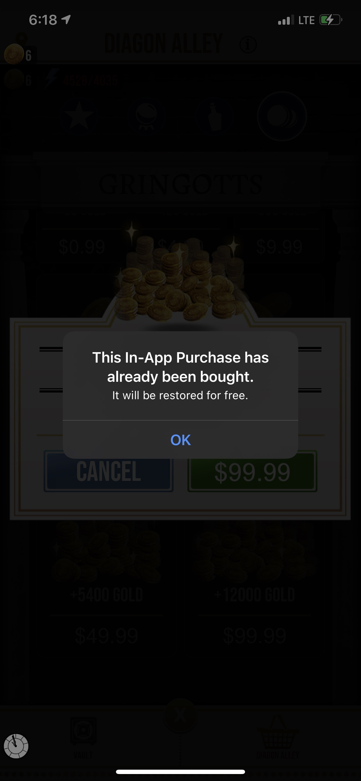 Immediately switch over to Gringotts and select the coins you want to purchase. Note: DO NOT select the coin amount that caused the problem in the first place. You know you selected the wrong one if it tells you that you already ordered it and Apple wants to restore it for free. The application will hang forever until you force it down. If this happens, repeat steps 1-5, and 7. Skip 6 because you already have the free gift.