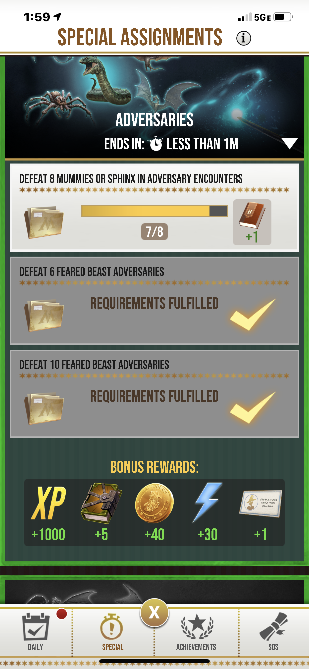 This is without a doubt the worst adversary event so far. Since I don’t get dark marks naturally where I live I have had to use edible dark marks and even though I’ve used over 5 dark marks I’m still short on the mummies and Sphinx because I keep getting acromantula or basilisks. Honestly if this keeps up I may have to quit because I won’t be able to afford to complete the challenges