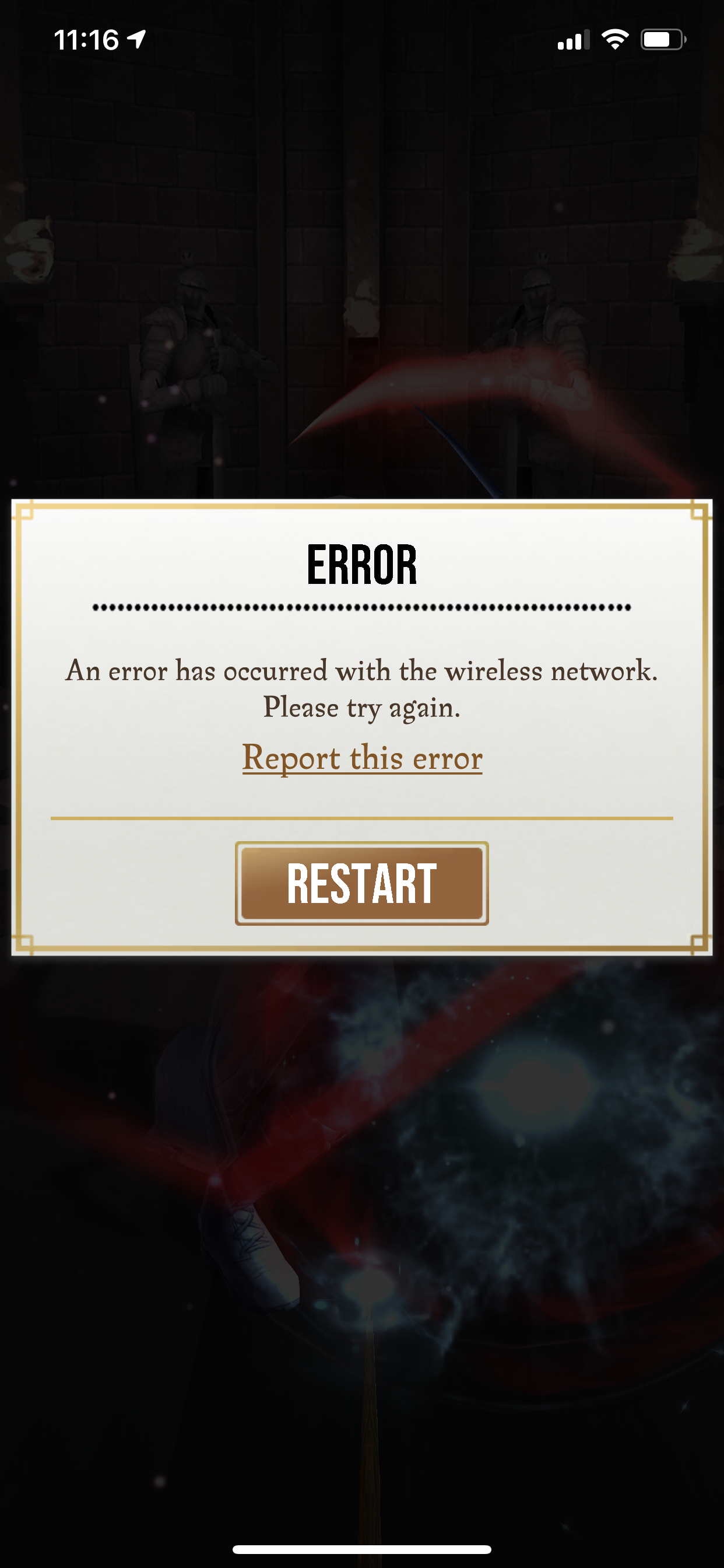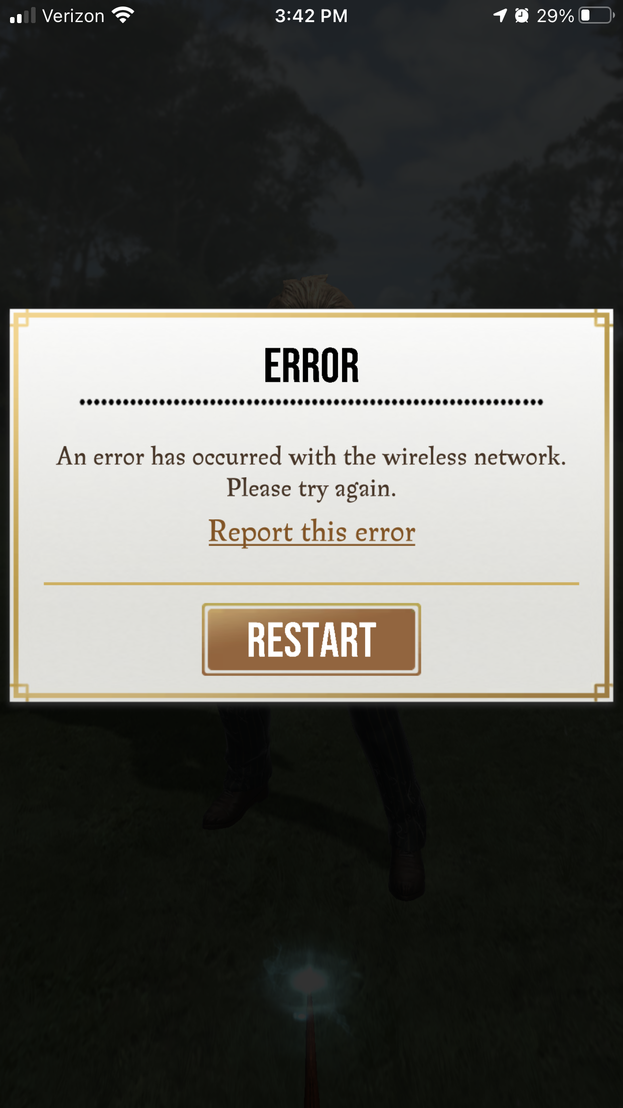 I have also gotten a network error when using potions in the fortress which popped up the screen to restart the game. It doesn’t happen with every potion. It happened at least twice at home when I had no other noticeable connectivity issues. I have asked around and this seems to be happening more than before the latest update to many wizards unite players.
