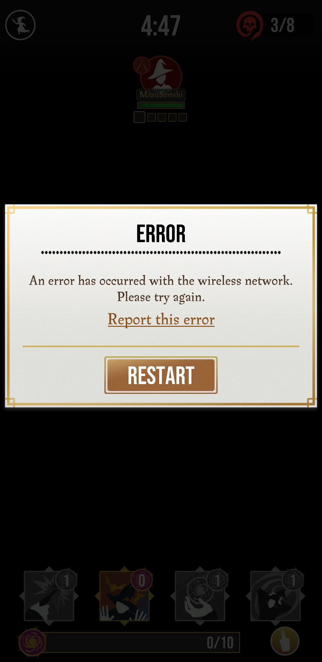 The Restart error is worse than ever. I experience it multiple times a day, and it usually happens right after I select a potion to use. It happens whether I'm in an ordinary encounter, a fortress battle or an adversary battle. I've lost numerous runestones or encounter/fortress points to this error.